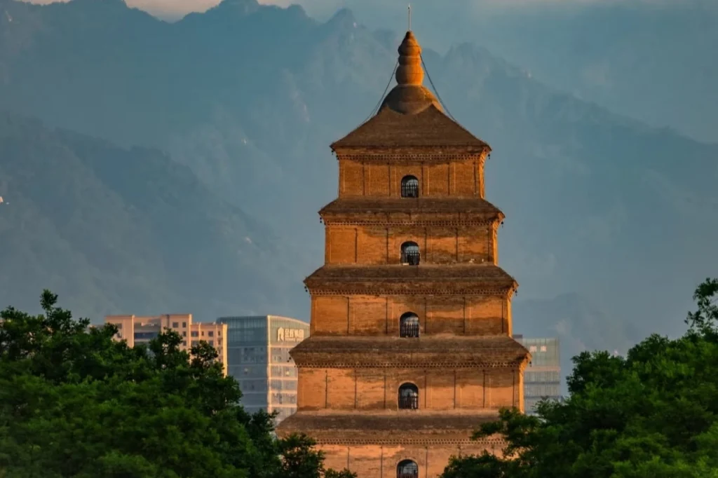 Большая Пагода диких гусей представляет собой многоярусное, квадратное, кирпичное сооружение из пятнадцати этажей. На перемычке высечены изображения архатов и узоры из трав, их превосходное мастерство отражает художественный стиль ранней династии Тан